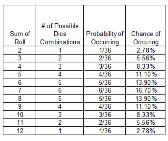 Look at the top line first. To throw a 2 (column 1) there is only 1 possible combination (column 2) of the dice that will give it to you, that is (1,1). At the other end of the scale (the bottom line of the chart), 12 also has only 1 combination and that’s (6,6). Both of their ‘probabilities of occurring’ and ‘% of chance’ are equal (column 3 & 4). Next we look at 3 and 11 (column 1). Each have 2 possible dice combinations (1,2) (2,1) & (5,6) (6,5) and both have identical ‘probabilities of occurring’ (2/36), etc. And so it goes with all the possible dice combinations as you discover the pattern of an upper number matching the parameters of a lower number in the chart. Except for 7. It’s unique in its ‘probability of occurring’ and is also, as it turns out, the most favorable of all the possible sums that a person can get in a throw of the dice as indicated by its ‘% of chance’ (16.7%).